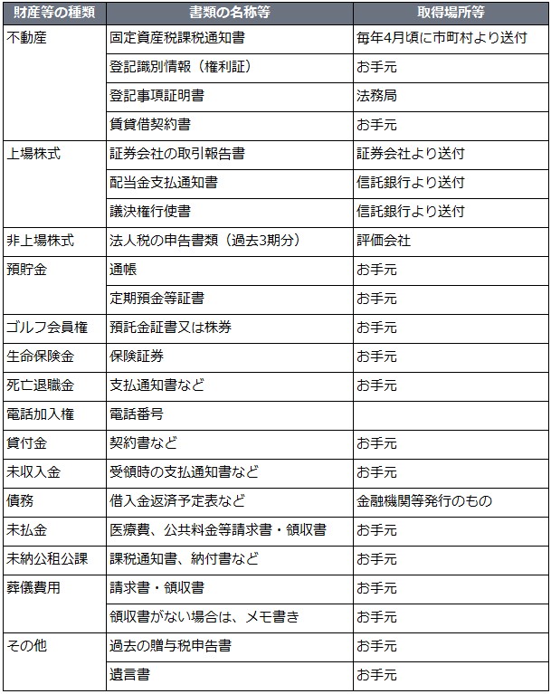 末尾に、亡くなった方の所有財産把握のために、ご遺族に準備をお願いしている主な書類を一覧にしました。